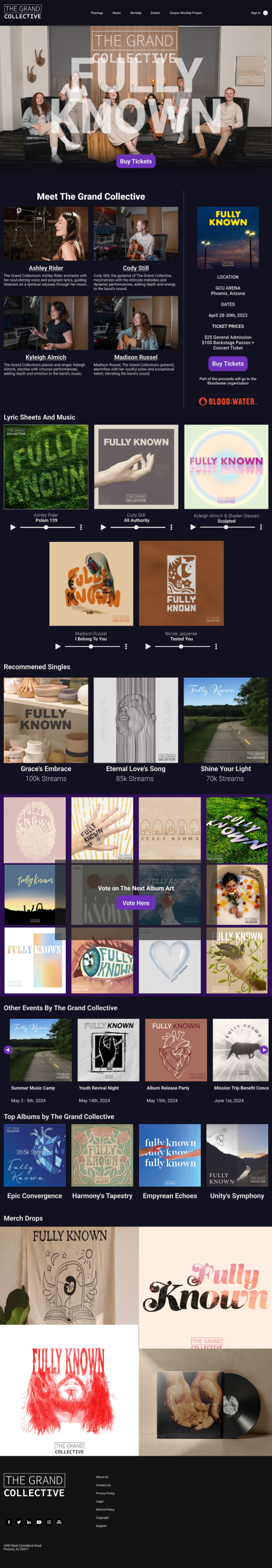 The Grand Collective was looking to market their band “Fully Known” by promoting their new songs. They are hosting an Event at GCU and need a new site to promote the event and their music. The band has many singles produced and uses a lot of art for their singles. The variety in styles allows for a lot of visual contrast. Their site uses multiple components that play the songs and show lyrics for users. Many scrolling features were used to show the multitude of events that Fully Known is hosting.