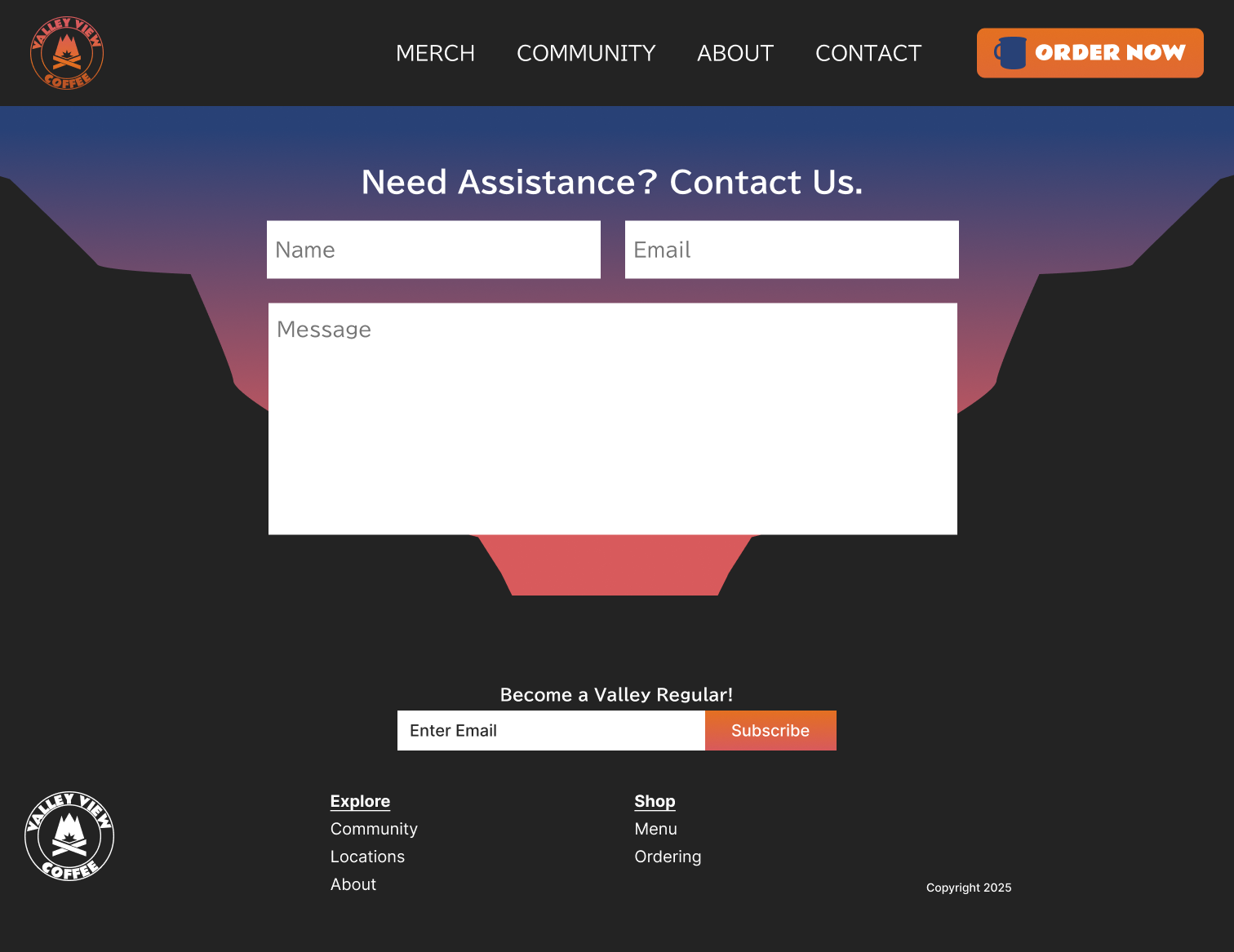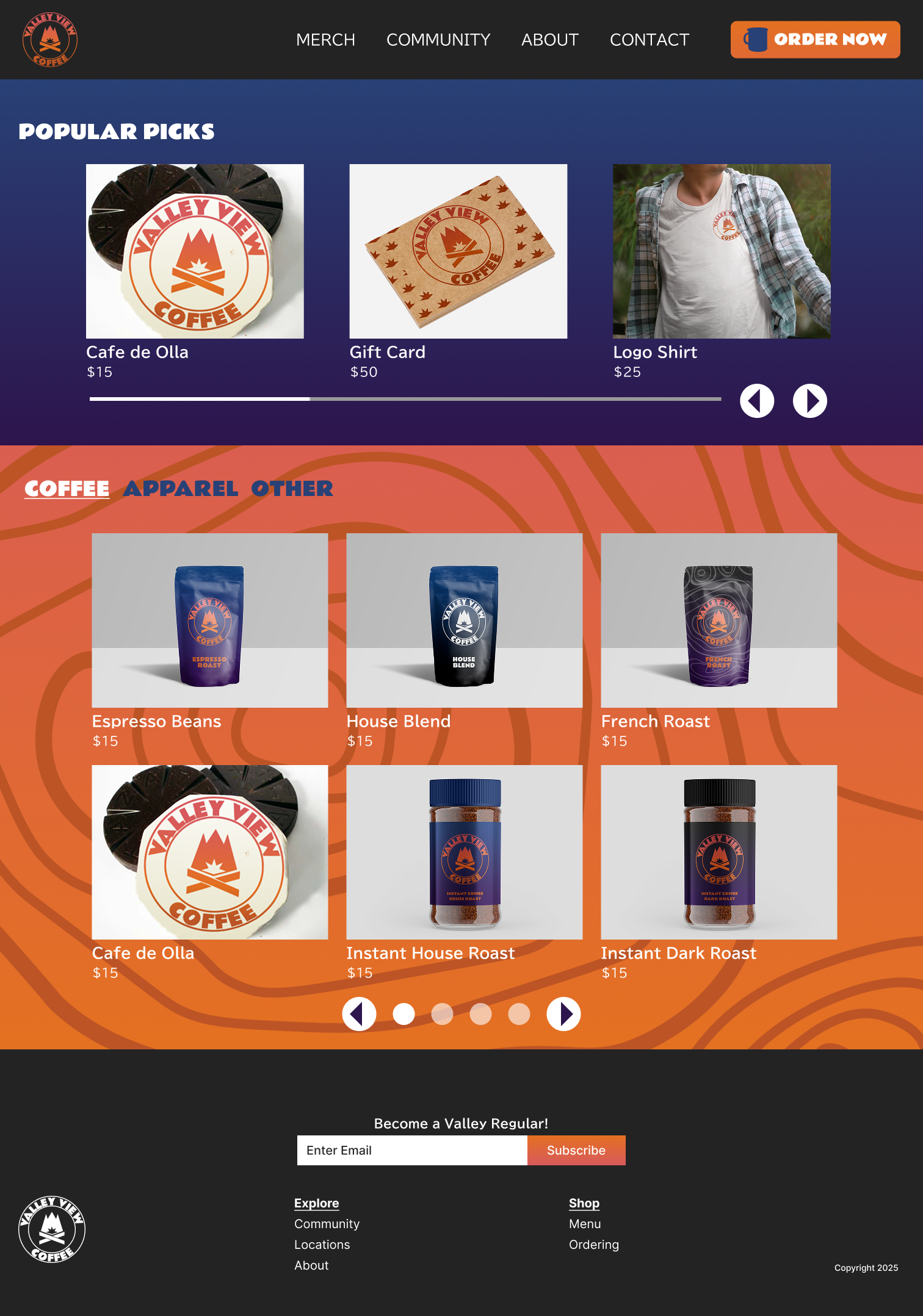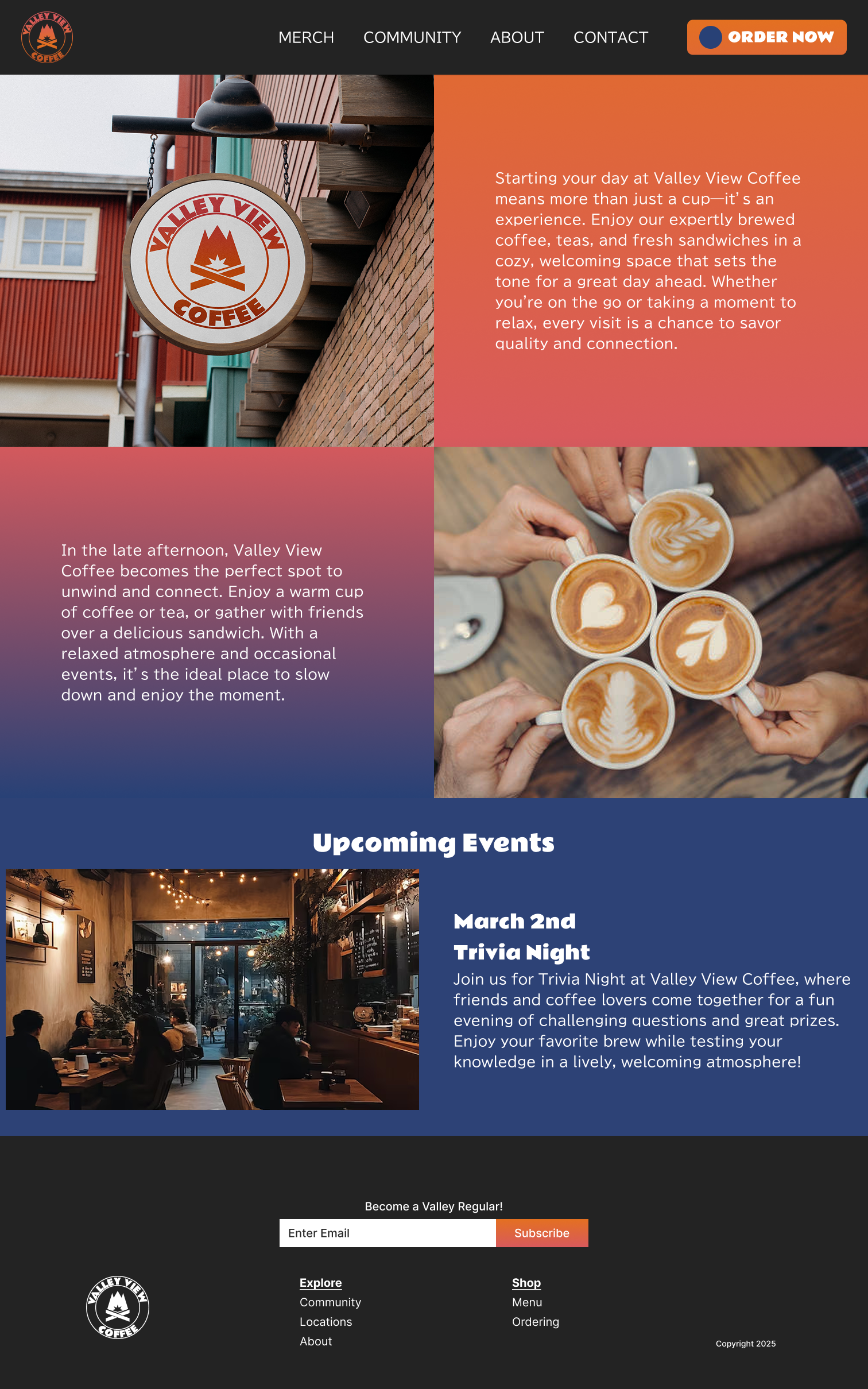 Valley View Coffee is a growing Coffee Shop Brand from Phoenix, Arizona. The new shop has just expanded to 3 restaurants and needs a website to help market new customers in the area. Valley View Coffee is a brand that intrigues people that look to sit down and relax with coffee in the morning and as a place to gather together later in the evening. A new brand identity was established to have the website and store collateral match and create a new cohesive style reminiscent of the valley sunrise.